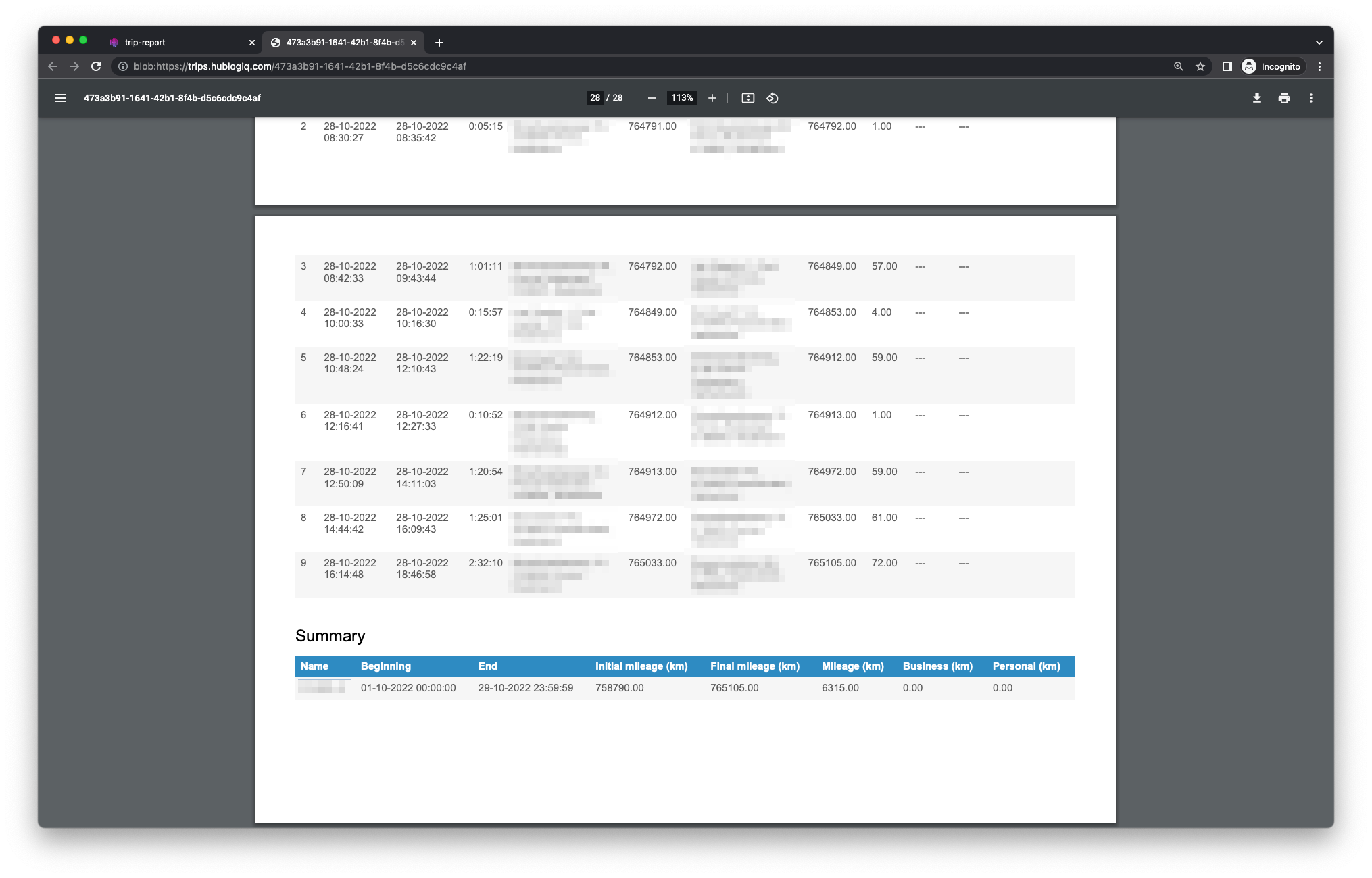 The main purpose of the application is scheduling the generation of trips reports on a daily, weekly or monthly basis. The reports include information such as the start and end locations, the driver, the mileage and private/business status.